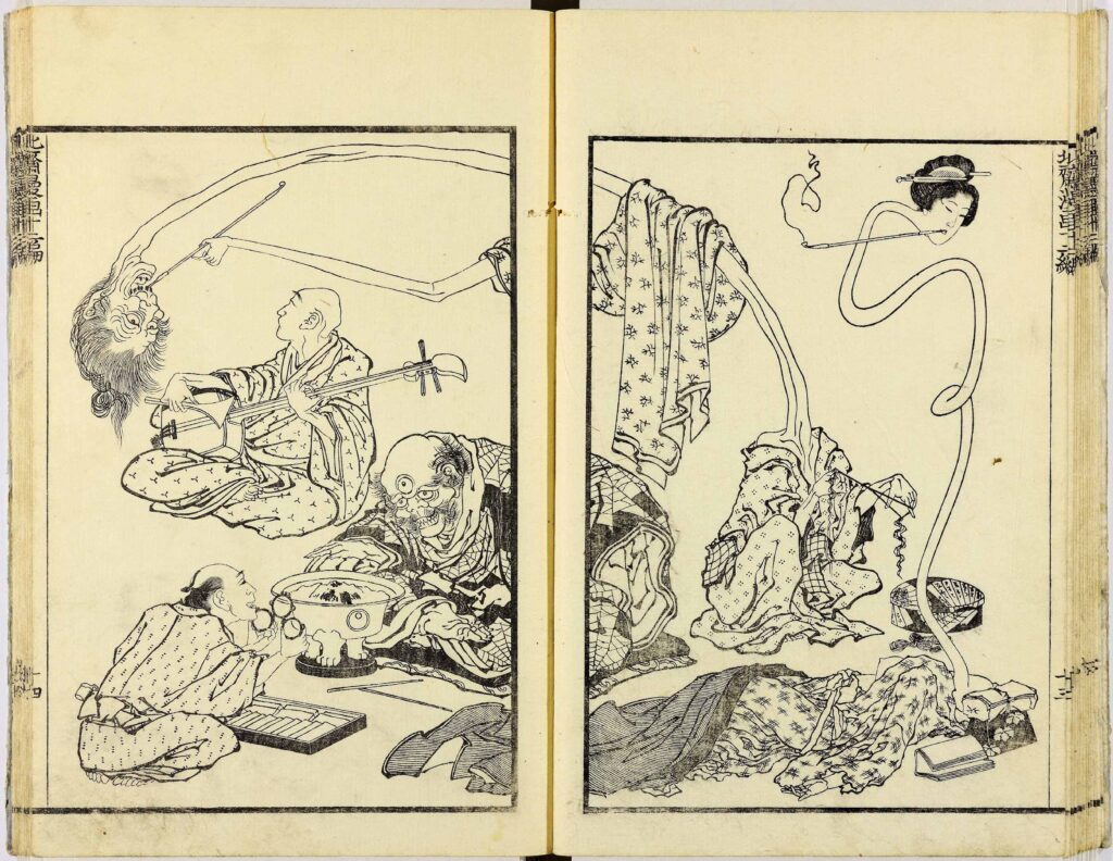 首がゴムのように長く伸びるタイプ。江戸時代の落語や草双紙で一般的になった姿です。寝ている間に無意識に首が伸びる「離魂病(りこんびょう)」の一種として、江戸の医学的見地から論じられることもありました。